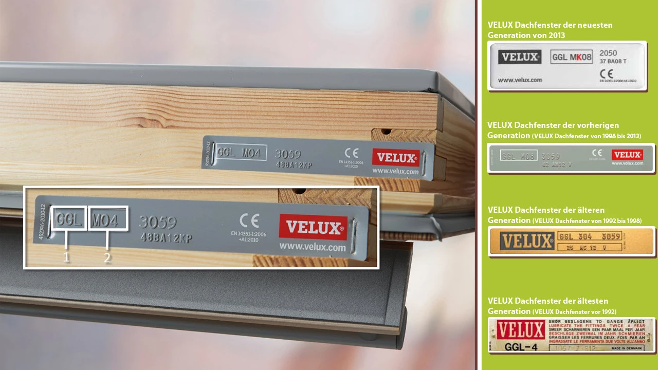 Jedes VELUX Dachfenster hat sein eigenes Typenschild, das Ihren Dachfenster-Code enthält. Der Code für das Dachfenster ist der Code, den Sie für die Bestellung benötigen. Je nach Baujahr Ihres Dachfensters kann das Typenschild variieren. (Typenschild – siehe VELUX-Größen-Abbildung)