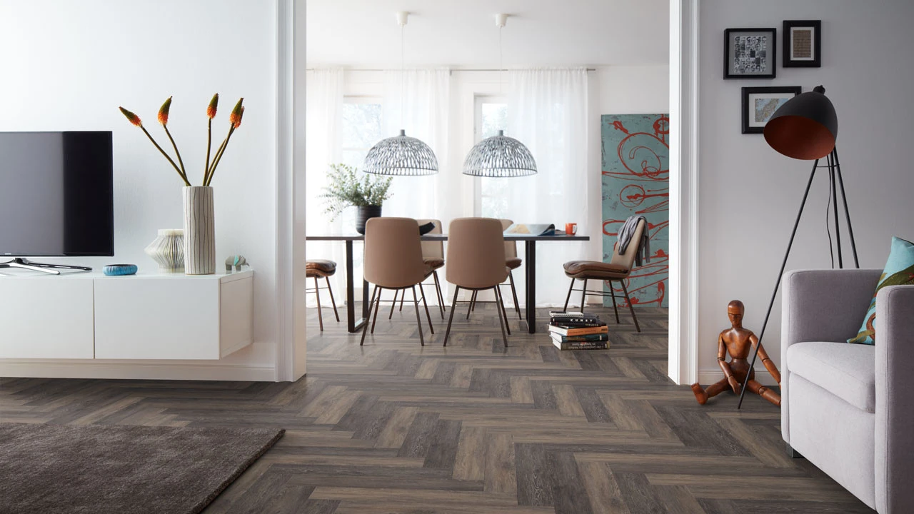 planeo SLY HERRINGBONE Lorraine ist Teil des neuen, klassischen Trends, der sich in zeitloser Eleganz präsentiert. Die Fischgrätoptik verleiht dem Raum mehr Tiefe und lässt ihn optisch größer wirken. Sowohl Möbel im Retro-Look als auch moderne Ausstattungen harmonieren mit diesem Boden.