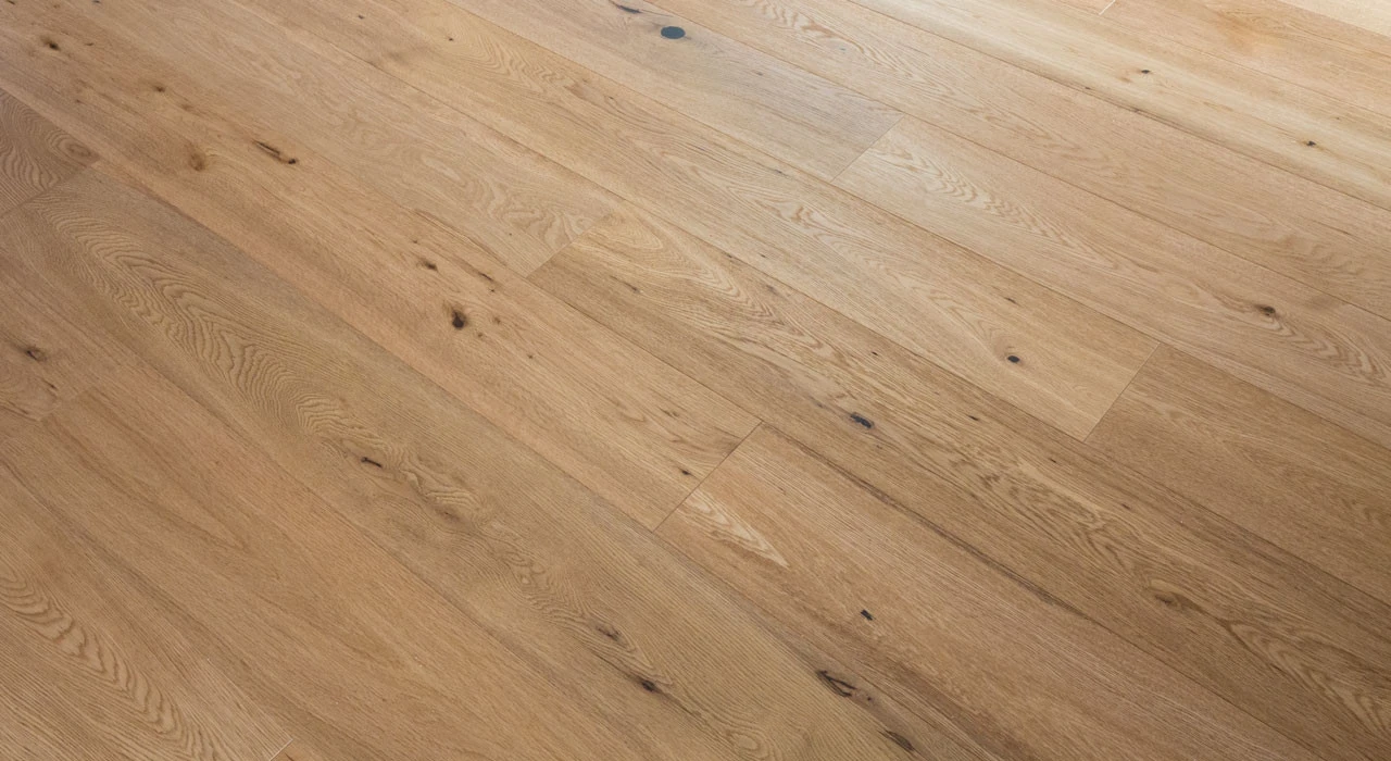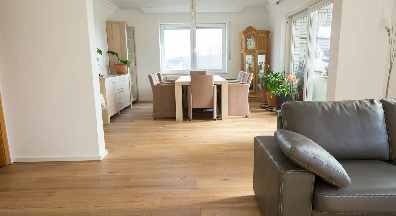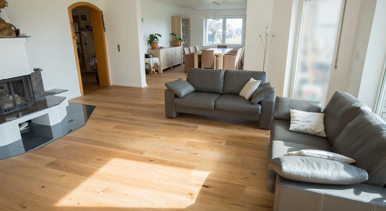 Für diesen Holzboden wurde CO2-neutrales Eichenholz verwendet. Deshalb ist dieser Boden besonders natürlich und wohngesund.