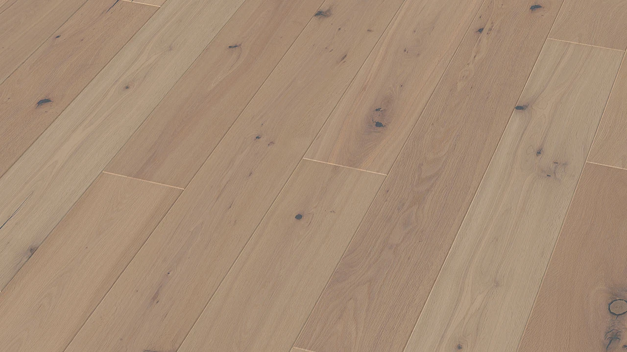 Für diesen Holzboden wurde CO2-neutrales Eichenholz verwendet. Deshalb ist dieser Boden besonders natürlich und wohngesund.