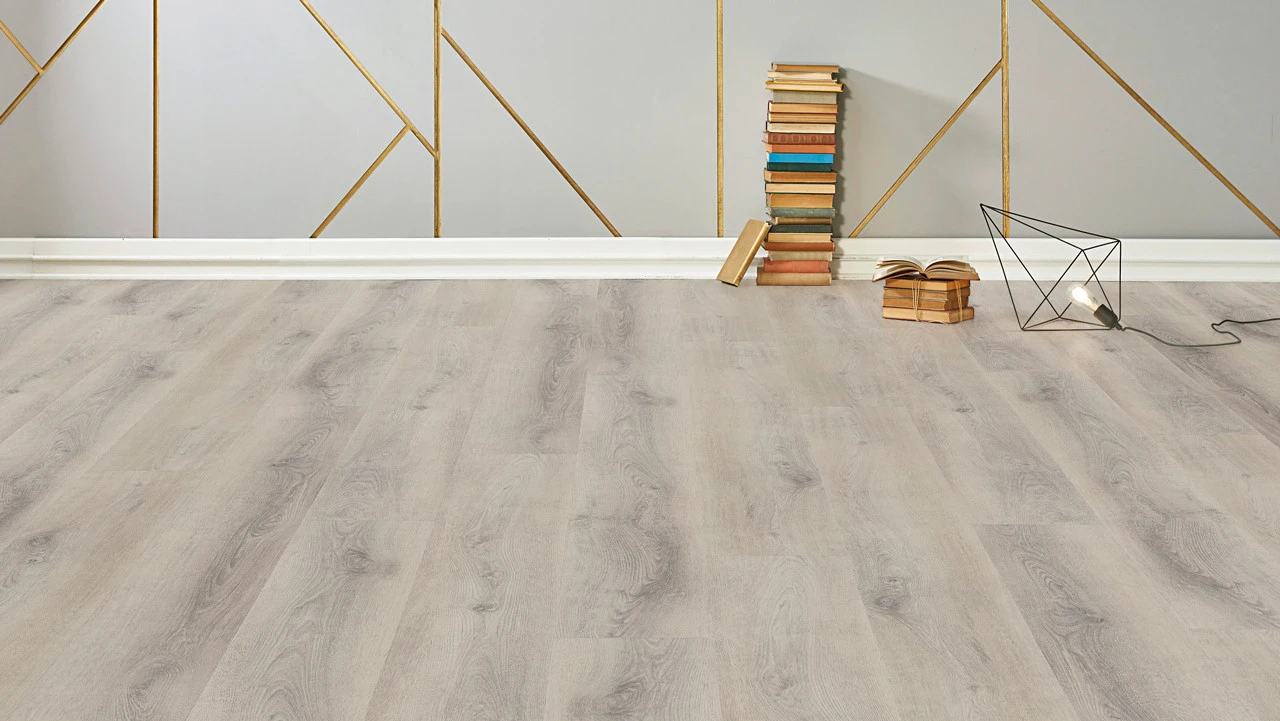 0,55 mm Nutzschicht – Rigid SPC – Fase (4-seitig) – Holzoptik – Landhausdiele – grau – Synchronprägung – Trittschalldämmung integr. – ohne schädl. Weichmacher