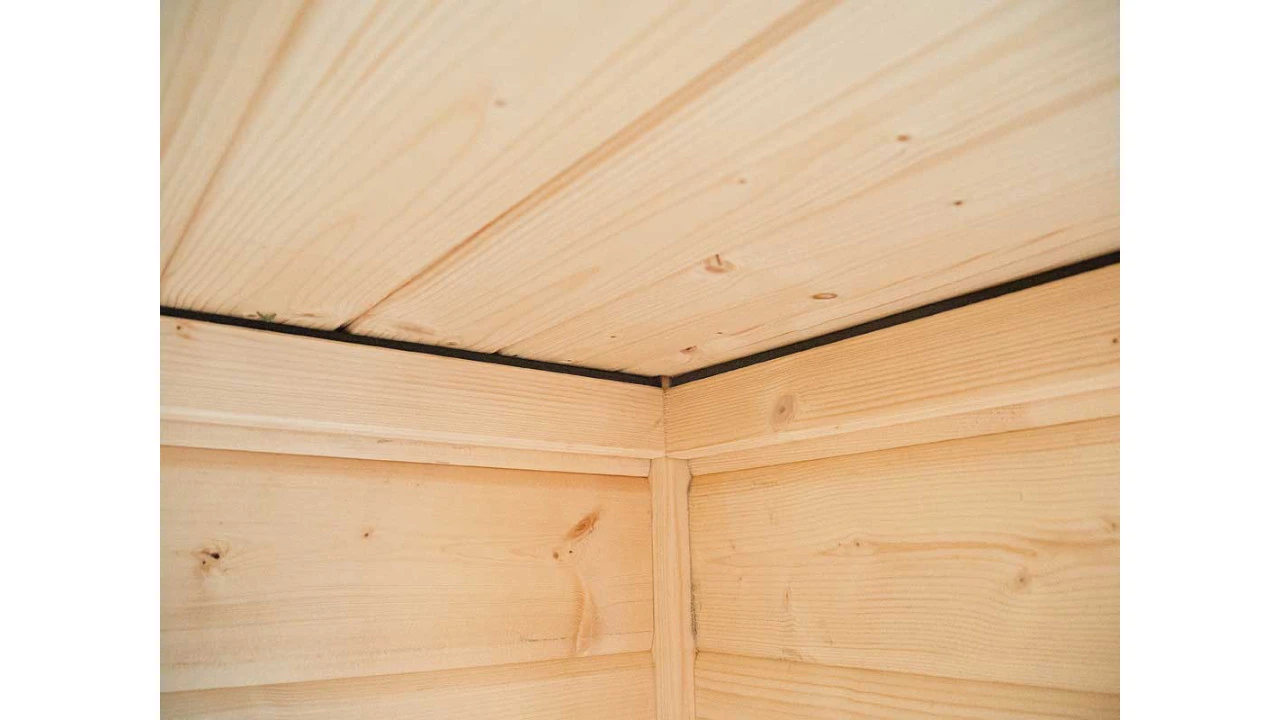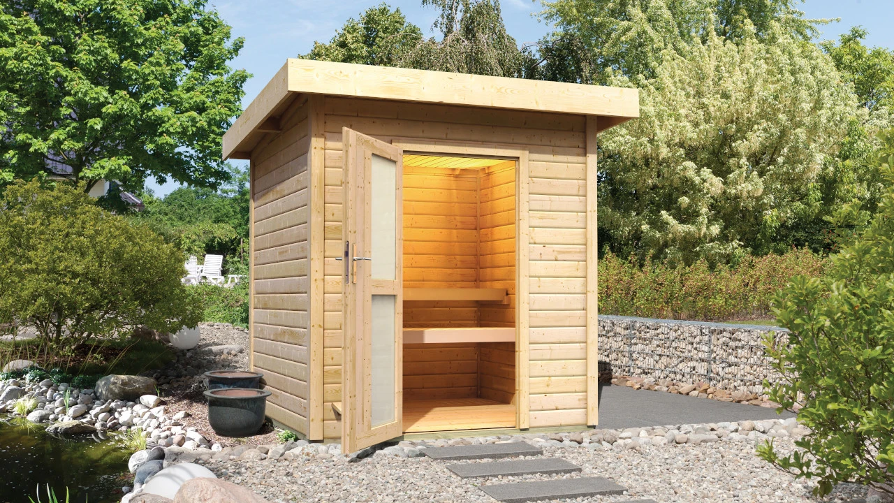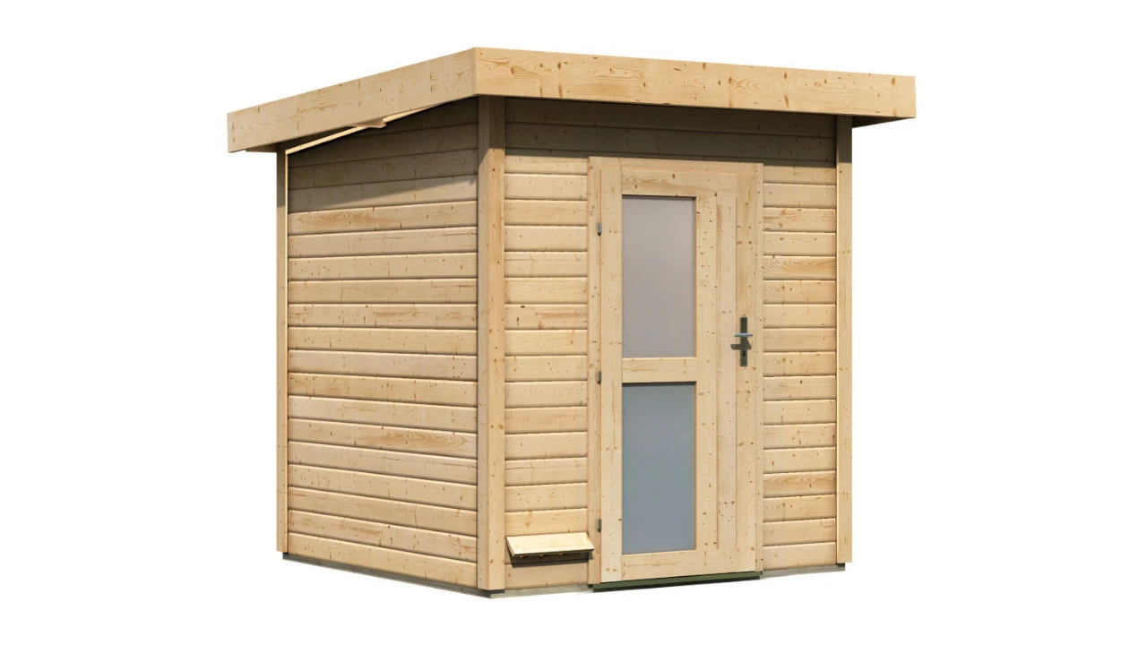 Mit dem planeo Saunahaus-Bausatz können Sie allein oder mit Freunden gemeinsam auf einer Grundfläche von 3,8m² wohltuende Saunagänge genießen.